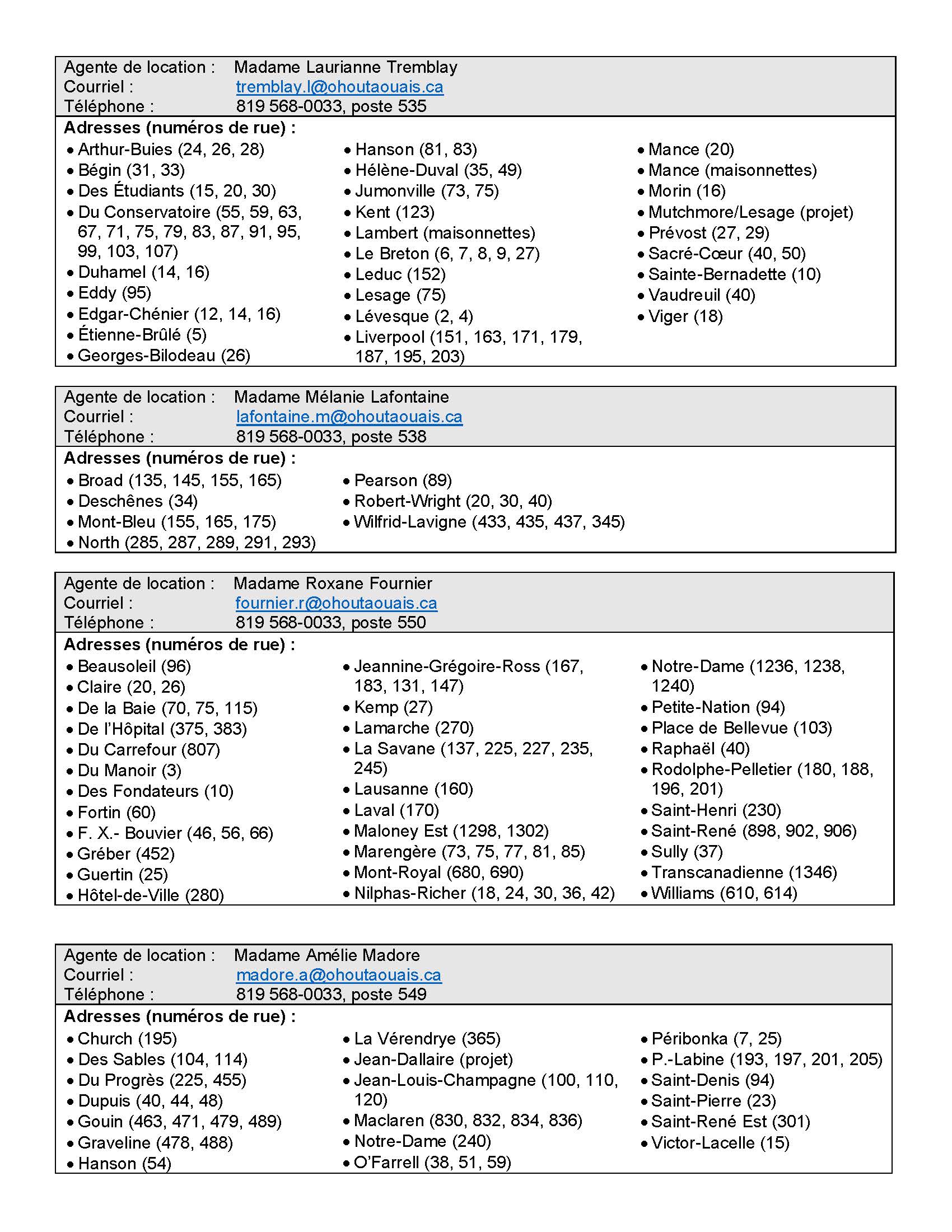 À compter de cet automne, chaque secteur sera pris en charge par un agent de location attitré. Ainsi, chaque locataire saura précisément à qui s’adresser pour toute question ou suivi concernant son logement. Cette nouveauté vise à faciliter le lien de confiance entre les locataires et le personnel responsable de leur secteur, en plus d’assurer un meilleur suivi personnalisé.